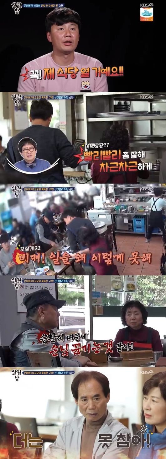 김승현의 아버지는 "잘한다 잘한다 하면 사람이 잘하게 돼 있다. 힘을 좀 실어줬으면 좋겠다"라고 말했다. 이에 큰아버지는 "승환이 때문에 손님이 끊기는 것 같다. 원래 손님이 줄을 서서 기다렸는데 승환이가 온 후로 손님이 끊겼다"라고 말했다.