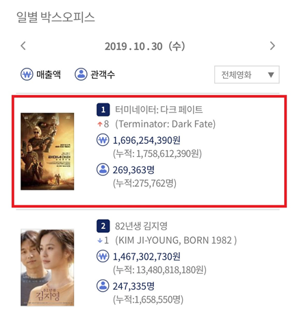 영화 '터미네이터: 다크 페이트가 지난 30일 개봉 첫날, 26만 9363명을 관객을 동원하며 전체 박스오피스 1위에 등극했다. '터미네이터: 다크 페이트'가 개봉과 동시에 '82년생 김지영' 등 쟁쟁한 화제작들을 모두 제치고, 전체 박스오피스 1위에 오르며 흥행 돌풍을 일으키고 있다.