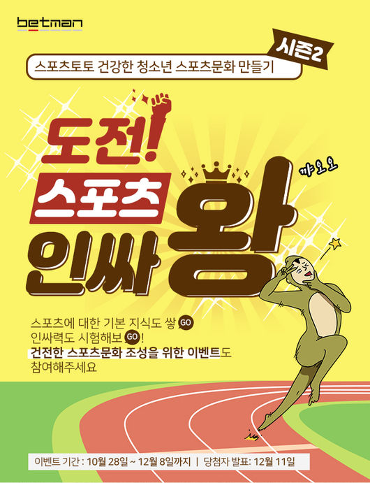 국민체육진흥공단이 발행하는 체육진흥투표권 스포츠토토의 수탁사업자인 ㈜케이토토가 대한민국 청소년들의 밝은 미래를 위해, ‘건강한 청소년 스포츠문화 만들기 시즌2-도전! 스포츠 인싸왕’ 캠페인을 전개한다.