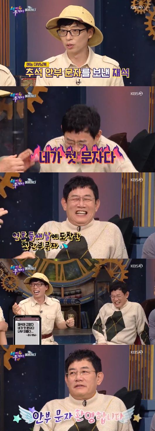 이어 유재석은 "명절이라서 문자를 드렸는데 예전엔 한참 후에 답장이 왔는데 이번엔 바로 왔다. 재석아 네가 첫 문자다 너무 외롭다고 하시더라"라고 말해 웃음을 자아냈다.
