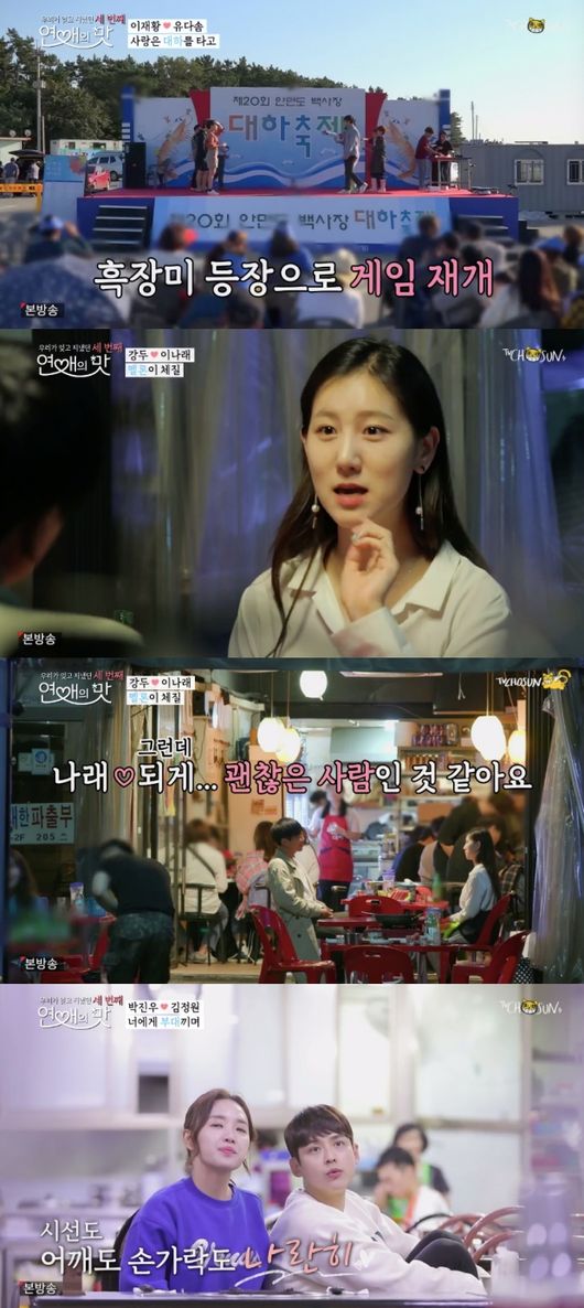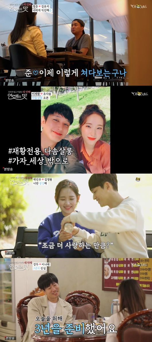 지난달 31일 오후 방송된 TV조선 예능 ‘연애의 맛3’는 정준과 김유지, 이재황과 유다솜, 강두와 이나래, 박진우와 김정원 커플의 데이트가 담겼다. 네 커플 모두 만난 지 한 두 번 정도됐는데 예상보다 빠른 속도로 가까워져 있었다.