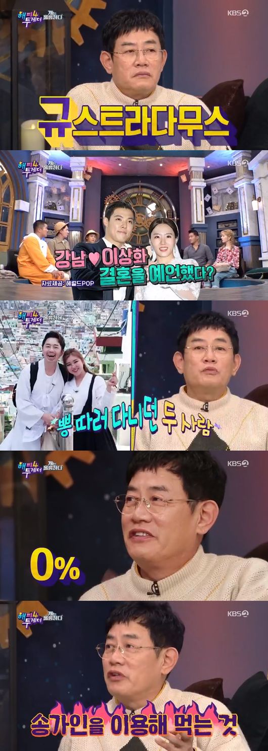 유재석은 이경규에게 "최근에 규스트라다무스라고 불리더라"라고 물었다. 이에 이경규는 "열애설 나오고 나서 강남군이 제 프로그램에 출연했다. 결혼할 것 같더라. 쭉 오는 게 있다"라고 말했다. 이어 이경규는 붐을 보며 "요즘 송가인씨랑 자주 다니는데 잘 될 확률이 없다. 송가인씨를 이용해 먹는 것" 이라고 말해 웃음을 자아냈다.