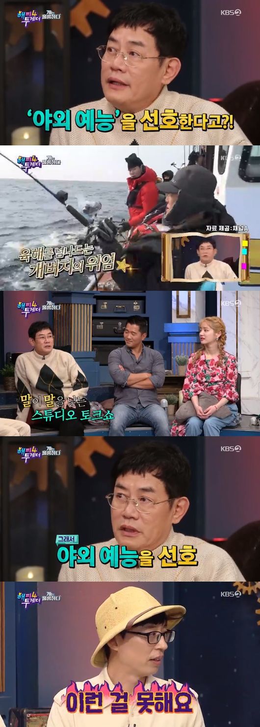 이경규는 "유재석처럼 많은 사람들을 받아주고 끌어주고 나는 못 한다. '힐링캠프' 할 때 나랑 참 안 맞았다. 야외가 잘 맞는다"라며 "스튜디오 진행은 유재석씨나 전현무씨가 잘한다"라고 말했다.