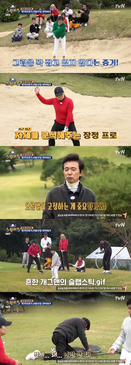 이날 '스윙키즈' 아이들은 제주도로 전지훈련을 떠나 벙커샷과 트러블샷 정복에 나섰다. 코치로는 장정 프로가 등장해 눈길을 끌었다. 장정 프로는 "경사면에서 샷을 할 땐 밸런스가 중요하다. 코어에 힘이 있어야 좋은 샷을 할 수 있다"라고 말했다. 아이들은 밸런스 패드 위에 올라가 샷을 진행했다.