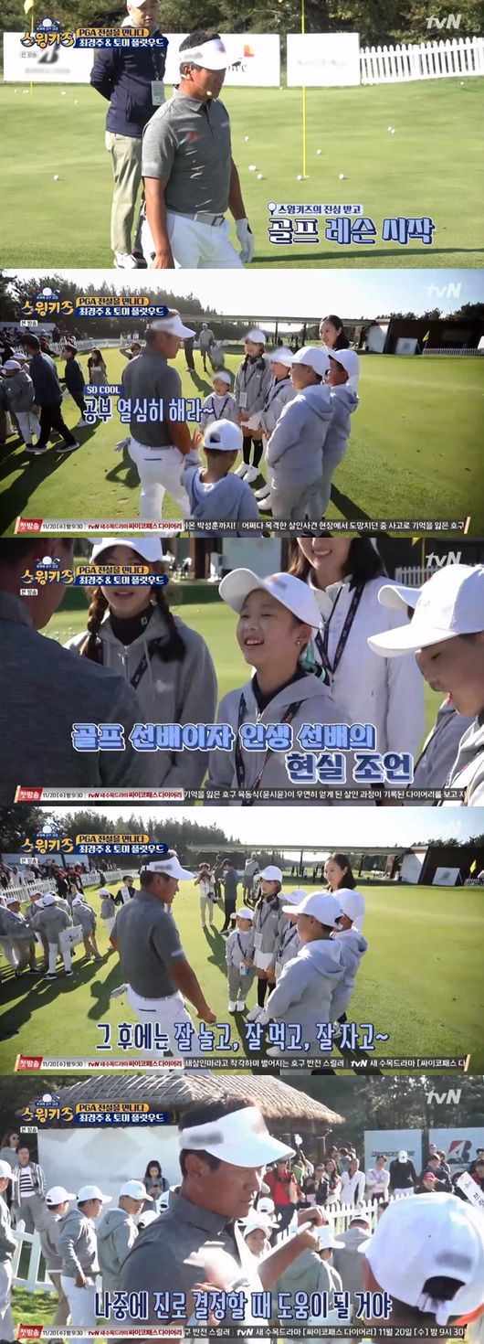 최경주는 '스윙키즈' 아이들에게 조언을 해주며 "공부를 열심히 해라. 국어, 영어, 수학 꼭 해야한다. 연습할 땐 집중해서 하고 그 후에는 잘 놀고, 잘 자야 한다"라고 말했다.