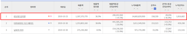 이는 이번주 개봉한 '터미네이터: 다크 페이트'를 제치고 하루 만에 전체 박스오피스 1위를 탈환한 것으로 쟁쟁한 신작 공세 속에서도 굳건한 흥행세를 보이고 있는 '82년생 김지영'의 흥행 화력을 실감케 한다.
