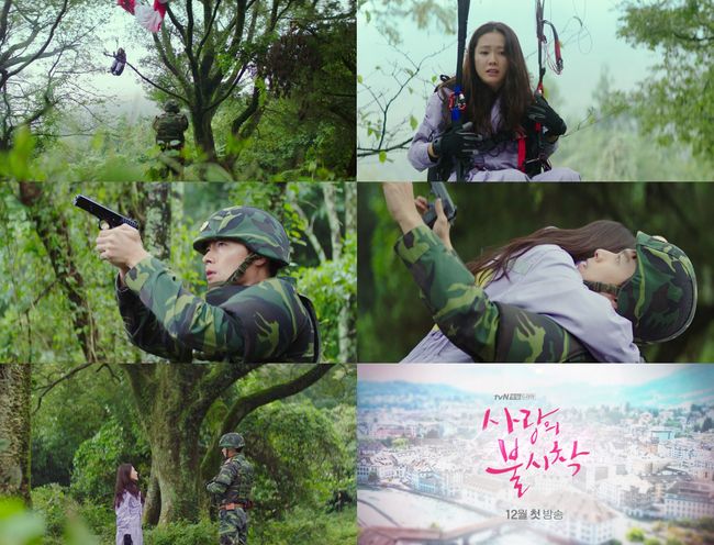 이번 티저 영상은 인적이 드문 산속 패러글라이딩 복장을 한 손예진(윤세리 역)이 나무 위에 걸려 “여기요..!”라며 도움을 구하는 장면으로 시작, 이를 발견하고 경계하며 조심스레 다가가는 군인 현빈(리정혁 역)의 모습이 드러나 시선을 사로잡았다.