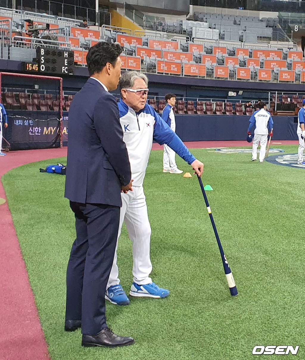 현역 은퇴 이후 자신의 이름을 내건 야구장학재단 운영을 비롯해 KBO 홍보대사 겸 기술위원, SBS 해설위원 등 왕성하게 활동중인 이승엽 이사장은 이날 경기 중계를 위해 야구장을 찾았다. 그라운드에 나타난 이승엽 이사장은 김경문 대표팀 감독에게 공손히 인사를 한 뒤 조용히 이야기를 나눴다.