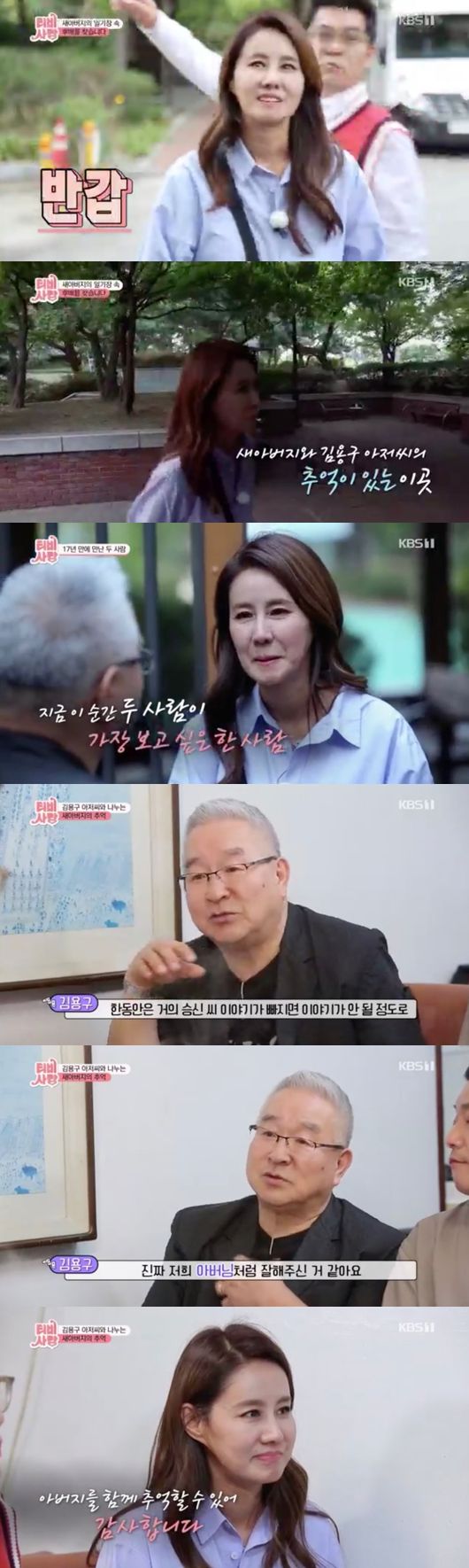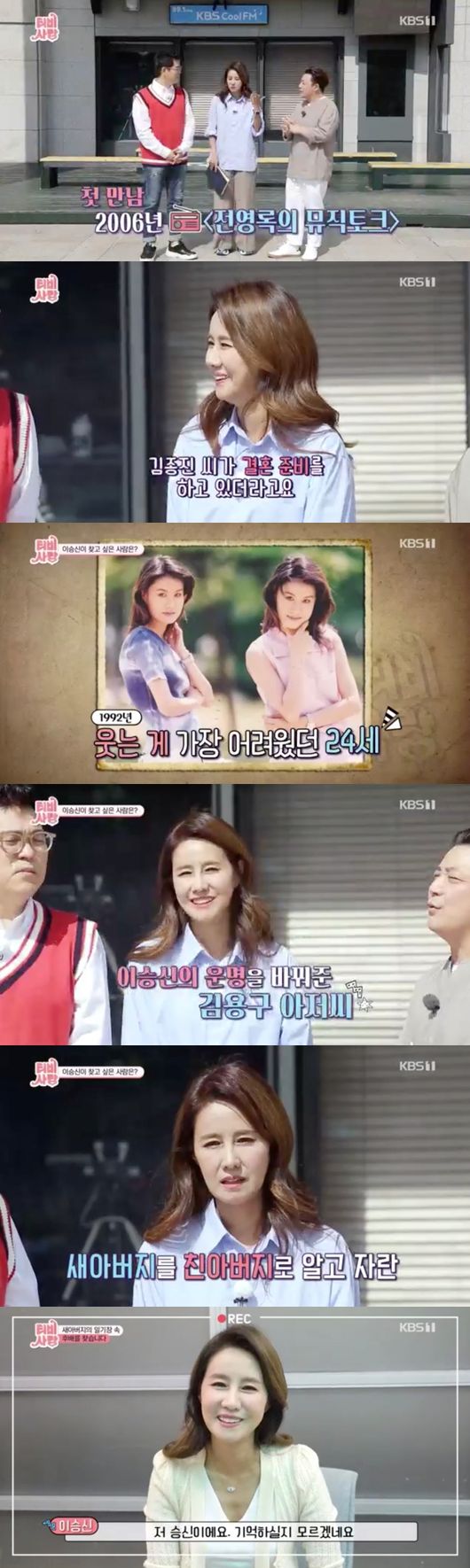 1일 방송된 KBS 1TV 'TV는 사랑을 싣고'에는 이승신이 출연, 새아버지의 직장동료 김용구 씨를 찾았다.