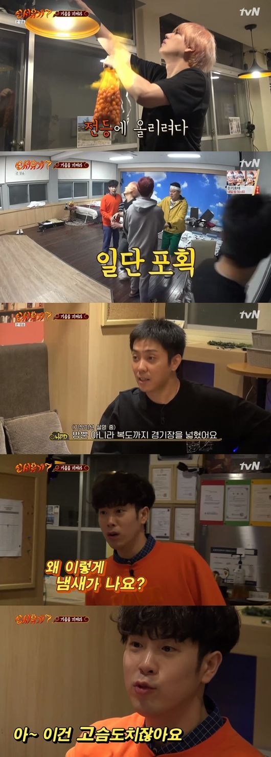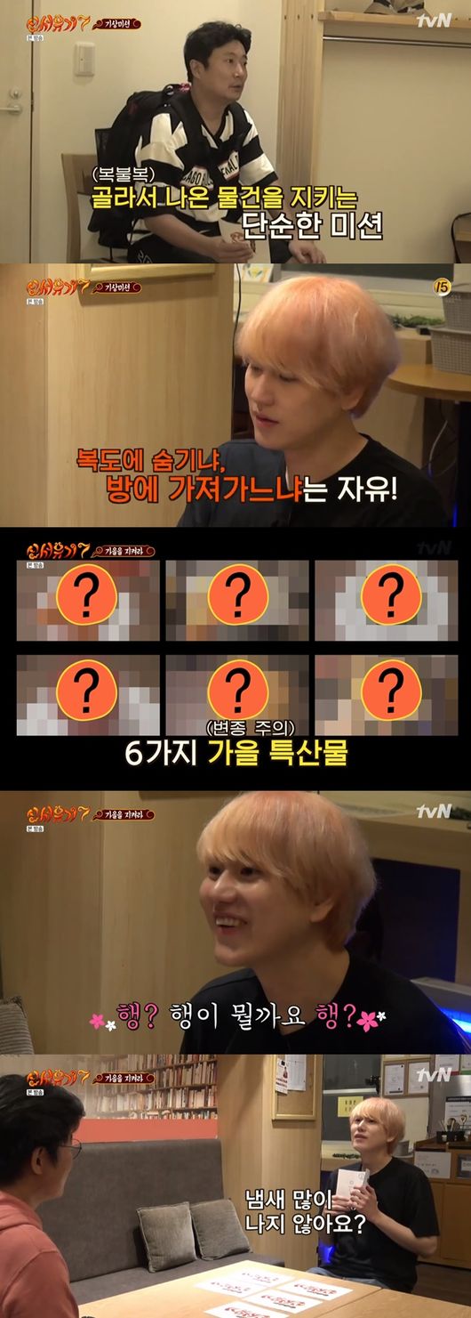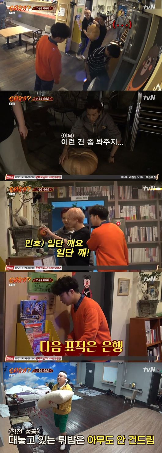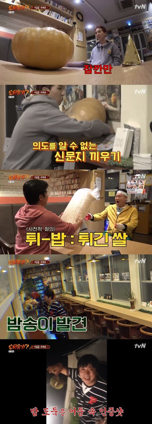 이수근은 책장에서 밤송이를 발견했다. 이수근은 밤송이를 발로 분리해 알갱이를 빼 버렸다. 그때 규현이 호박을 발견해 태연하게 들고 나갔다. 이 모습을 본 송민호는 깨진 호박을 보고 주저 앉아 "이런 건 좀 봐주지"라고 말해 웃음을 자아냈다.
