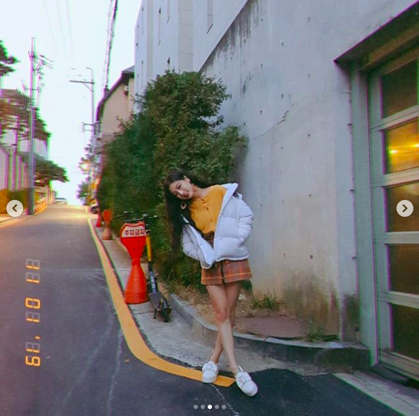 사진 속에서 정예인은 가을 분위기가 물씬 나는 스커트에 흰색 패딩을 입고 있는 모습. 쭉 뻗은 각선미가 눈길을 사로잡는다.