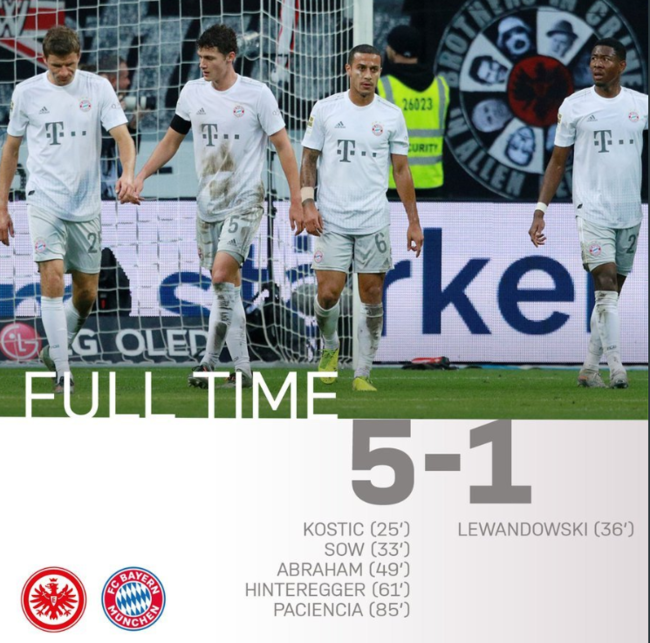 프랑크푸르트전 완패로 뮌헨은 승점 18점에 머물며 선두 보루시아 묀헨글라드바흐(승점 22) 추격에 실패했다.