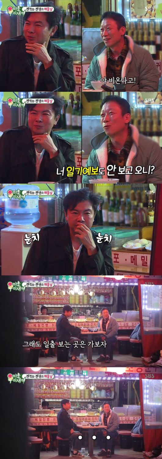 쌀쌀한 새벽에 도착, 두 사 람은 정동진 역앞 추억의 낭만포차에 발길을 옮겼고, 정동진 온 기념으로 사이좋게 함께 술잔을 기울였다.두 사람은 해돋이만 기다리고 있었으나 갑자기 빗줄기가 쏟아졌다. 정석용은 임원희에게 "넌 일기예보 안 보냐"며 원망, 임원희는 "그래도 일출 보는 곳에 가보자"며 눈치를 봤고, 정석용은 "술이나 마시자"고 말하며 자리를 이동했다.