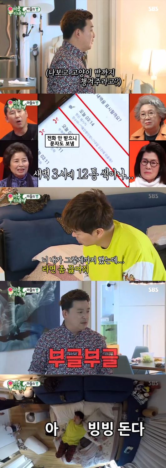 박수홍네 찾은 윤정수가 그려졌다. 못 보던 고양이가 거실에서 나오자 박수홍母는 깜짝 놀랐고 윤정수도 어리둥절했다. 박수홍은 만취로 힘들어하면서 여전히 술병에 괴로워하는 모습이 그려졌다.
