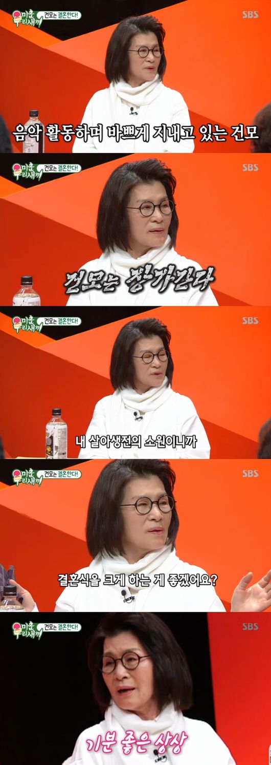 MC 신동엽이 김건모의 근황을 물었고, 음악활동하며 바쁘게 지낸다고 했다. 이어 김건모의 결혼에 대해 직접적으로 물었다. 이에 김건모母는 "한 가지 확실한 건, 장가간다"고 대답을 전하면서 "내 살아생전 소원, 우리 건모는 그 소원을 꼭 이뤄줄 것"이라 말해 모두를 기대하게 했다.