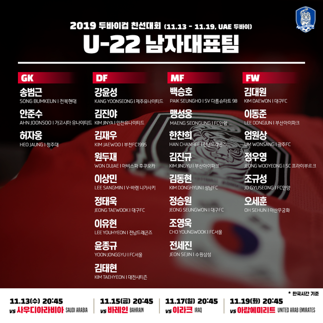 GK: 송범근(전북현대), 안준수(가고시마 유나이티드), 허자웅(청주대)