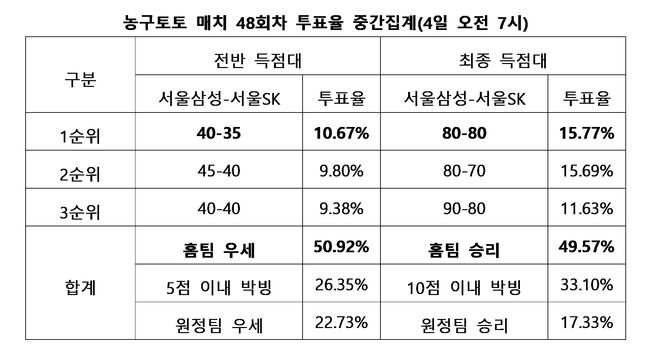 자세한 투표율을 살펴보면, 양팀의 10점 이내 박빙은 33.10%를 기록했고, 원정팀 서울SK의 승리 예상은 17.33%로 나타났다.