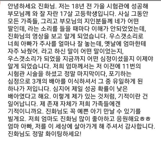 이어 "수많은 글들중..그 많은 사례들 중에 넘 놀라운 글이 있었습니다. 시험관 시술로 태어난 17살 소녀가 남긴 글인데요. 이밤에 넘 뭉클해서..슬쩍 공유해봅니다"라고 적었다.