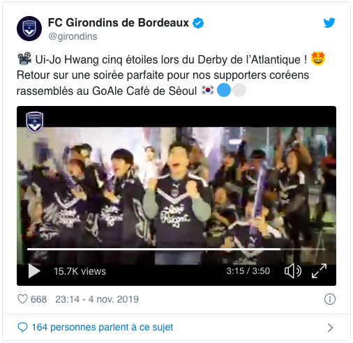 보르도 공식SNS는 “황의조가 애틀란틱 더비에서 환상적인 별 다섯개짜리 활약을 펼쳤다. 서울에서 모인 한국인 팬들에게 환상적인 밤이었다”며 황의조 단관 이벤트를 소개했다.