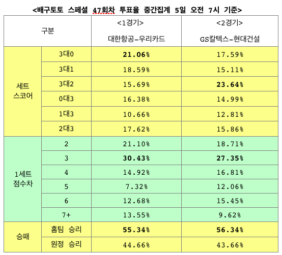 원정팀 현대건설의 승리 예상은 43.66%의 투표율을 기록했고, 최종 세트스코어에서는 3-2 GS칼텍스 승리 예상(23.64%)이 가장 높게 집계됐다. 1세트 점수차 예상에서는 3점차(27.35%)가 1순위로 집계됐다.