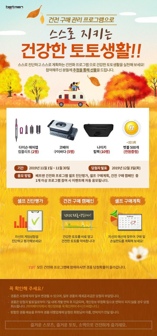 위 세 가지 건전화 프로그램 중 1개 이상에 참여할 경우 이번 이벤트에 자동으로 응모되며, 추첨을 통해 다이슨 에어랩 컴플리트(2명), 코베아 구이바다(5명), 나이키 힙팩(10명)을 증정한다. 또한 참여자 전원에게는 1인 1회에 한해 베트맨 사이트 내의 다양한 경품 응모가 가능한 벳볼 500개를 지급한다.