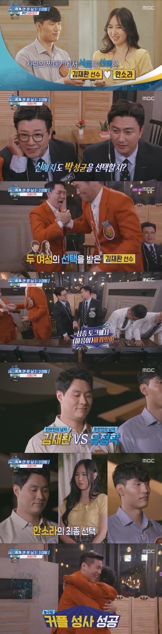 활발하게 진행을 하는 정균과는 달리 재환은 너무 말 수가 적은 모습으로 붐과 장훈을 불안하게 했다. 전반전이 끝나고 1차 선택애서 안소라X김재환 커플, 신예지X박정균 커플이 성사되면서 유정학 중계석에 앉아있는 병현과 제동을 불안하게 했다.