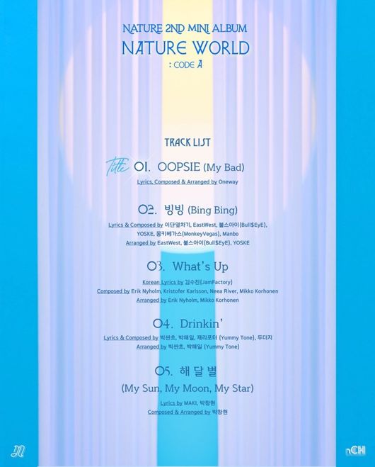 이 중 타이틀곡은 1번 트랙에 수록된 ‘OOPSIE’로, 네이처가 어떤 새로운 콘셉트의 음악 및 퍼포먼스로 감탄사를 불러일으킬지 귀추가 주목된다.