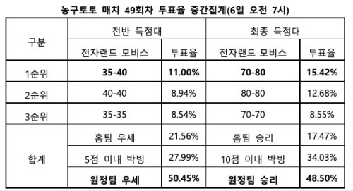 자세한 투표율을 살펴보면, 양팀의 10점 이내 박빙은 34.03%를 기록했고, 홈팀 전자랜드의 승리 예상은 17.47%로 가장 낮았다.