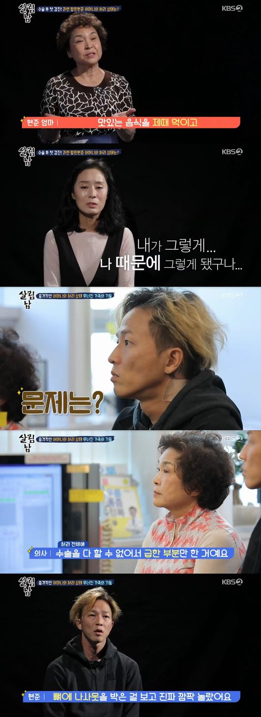 팝핀현준은 수술후 첫 검진한 母를 걱정했다. 아니나 다를까 의사는 수술은 잘 됐으나 고정된 허리로 인해 다른 척추가 안 좋아질까 걱정했다. 의사는 "일을 하게되면 더 나빠질 것"이라면서 세 달간 뼈가 붙을 때까지 꼼짝하면 안 된다고 했다. 다른 척추들이 안 좋아지면 못 걸을 수도 있다며 심각한 상태를 전하자 모두 깜짝 놀랐다. 현준은 "허리에 나사못이 박혀있는데 내가 너무 가볍게 생각했던 것 같다"면서 "휠체어 탈 수 있단 소리에 가슴이 철렁 내려앉았다"며 방관하던 자신에게 짜증이 나며 이제 살림을 해야겠구나 마음을 먹었다고 했다.