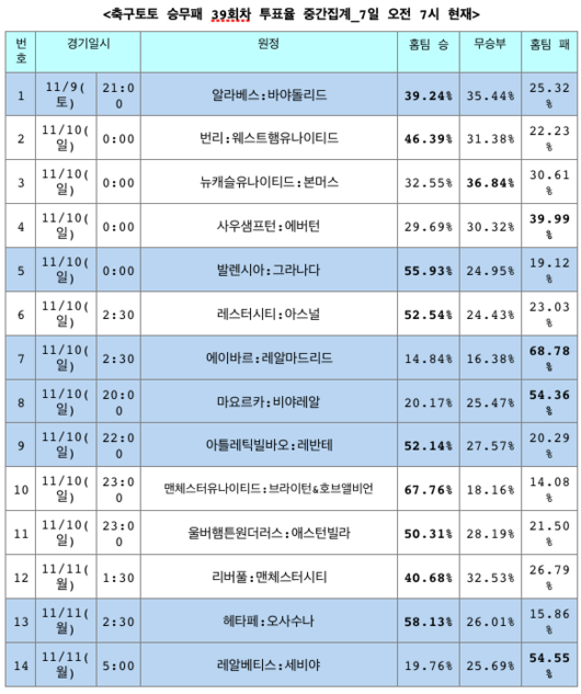 한편, 이번 승무패 39회차는 오는 9일(토) 오후 8시 50분에 발매를 마감하며, 경기가 모두 종료된 후에 결과가 공식 발표된다.