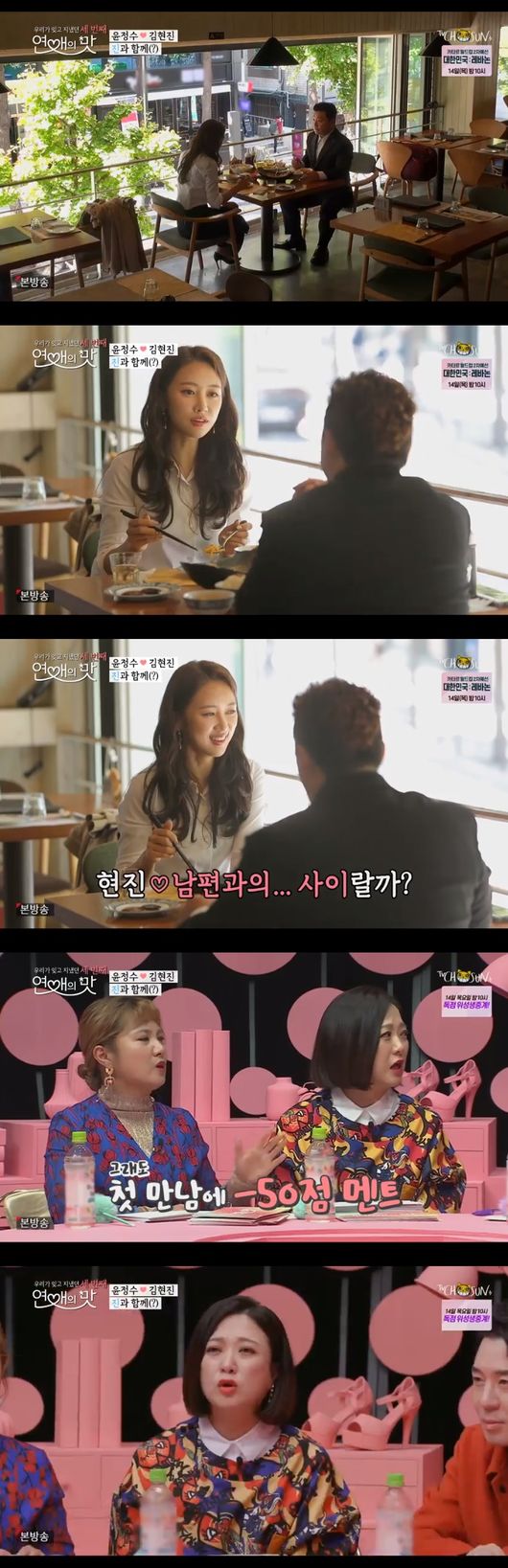 이후 윤정수는 김현진에게 꿈꾸는 가정에 대한 이야기가 뭐냐며 궁금해했고건넸다. 이에 김숙은 첫만남에 가정을 꾸리는 이야기를 왜 하냐며 답답해했다. 김현진은 "가정에서 중요한 건 남편과의 사이다. 애가 중요하지 않다"고 말했고 윤정수는 "저랑 생각이 비슷하다"며 대답했다. 이어 윤정수는 가고 싶은 곳 있냐고 물었고 김현진은 한적한 곳에서 걷고 싶다고 말했다.