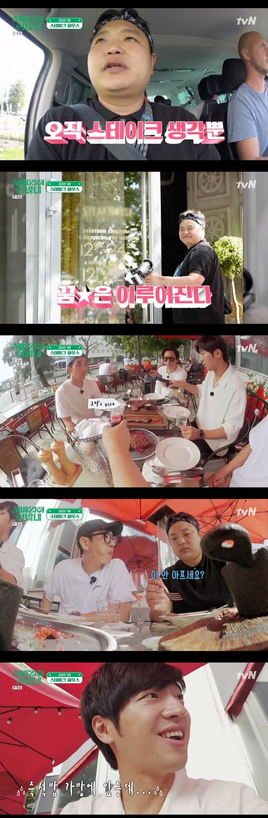 2박 3일만에 제대로 된 음식을 즐긴 멤버들은 맛있다고 감탄했다. 이선균은 "이 집 잘한다"라며 숟가락질을 멈추지 못했다. 이어서 스테이크가 등장했다. 기다리던 스테이크를 맛 본 고규필은 "정말 맛있다"라고 행복해했다.