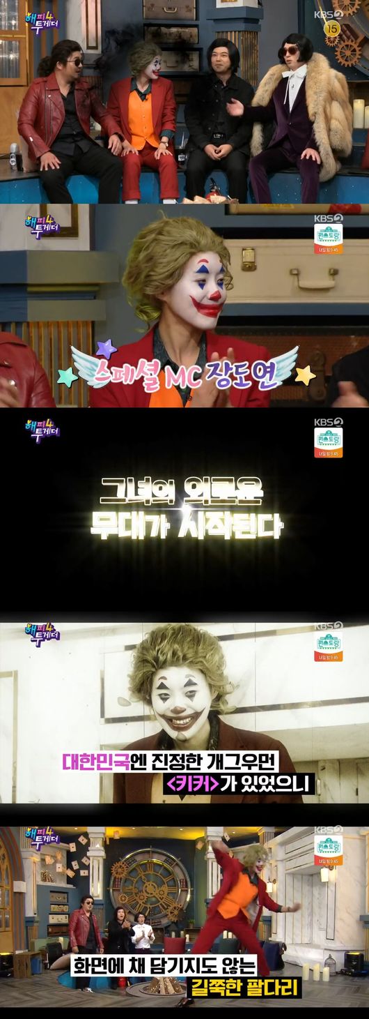 7일 방송된 KBS 2TV 예능 '해피투게더 시즌4'에서 먼저 스페셜 MC로 장도연이 일일조커로 분장해 출연했다. 장도연은 "이렇게 분장하니 엄마도 못 알아보다"면서 급기야 조커춤을 재연해 모두를 폭소하게 했다.