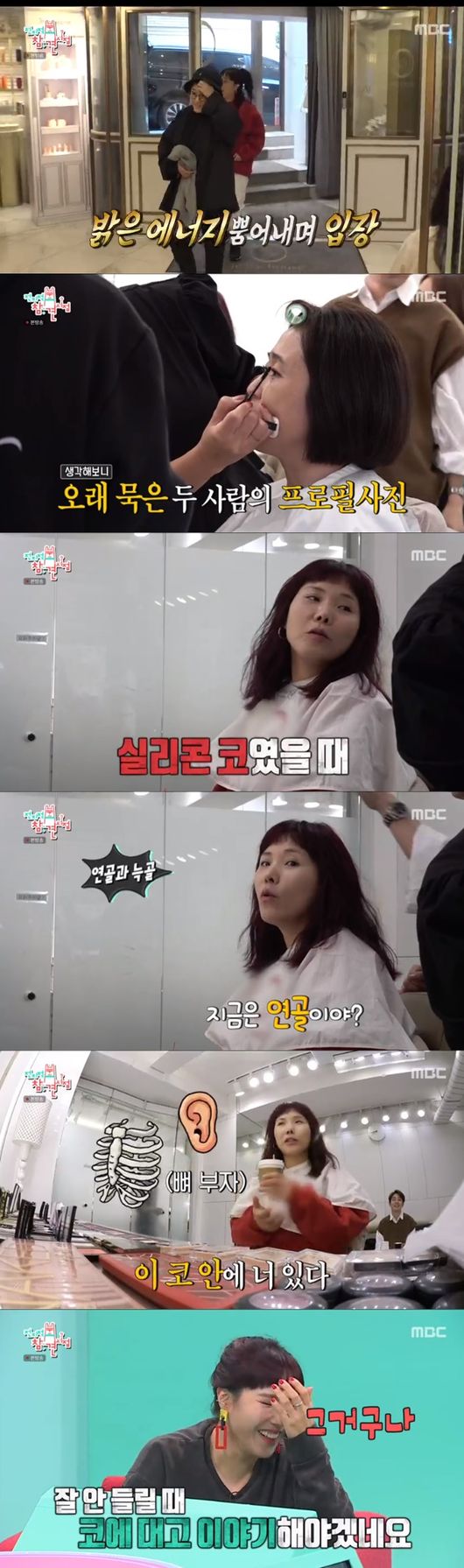 이후 두 사람은 미용실에 도착했다. 그곳에서 신봉선은 "예전에 실리콘 있을 때 프로필 사진 찍었다고 밝힌 뒤 이번엔 연골, 늑골. 이것저것 다 있다. 종합선물 같은 코라며 코 재수술 사실을 전했다. 이어 신봉선은 "그때 코가 퉁퉁 부어서 일이 없었다. 코를 얻고 일을 잃었다"고 말해 모두를 폭소케했다.