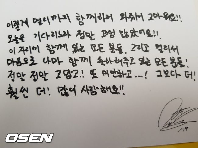 대성은 자필 엽서를 준비했다. 대성은 "이렇게 멀리까지 함께 하러 와줘서 고마워요! 오늘을 기다리느라 정말 고생 많았어요! 이 자리에 함께 있는 모든 분들 그리고 멀리서 마음으로 나마 함께 축하해주고 있는 모든 분들 정말 정말 고맙고 또 미안하고 그보다 더 훨씬 더 많이 사랑해요"라는 메시지를 담아 팬들에게 전달했다.