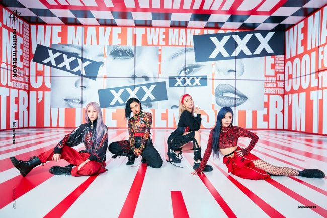 공개된 사진 속 마마무는 레드와 블랙의 강렬한 톤앤 매너로 세상 힙한 패션을 완성했다. 워커에 트레이닝복을 매치해 스포티한 매력의 문별, 촉촉하게 젖은 헤어스타일과 화려한 상의로 열정적 매력을 드러낸 화사, 블랙 의상에 레드 헤어밴드로 포인트를 준 솔라, 강렬한 레드 의상에 매혹적인 자태의 휘인까지 힙한 비주얼을 자랑했다.