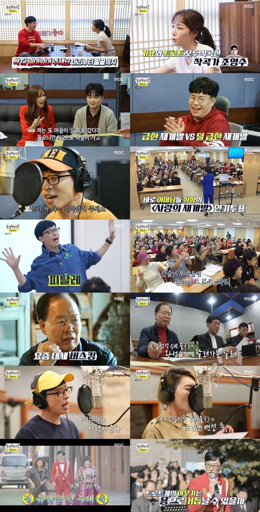 이어 유재석은 김이나가 추천한 ‘내공만렙’ 조영수 작곡가의 작업실을 찾았다. 트로트 ‘사랑의 배터리’, ‘잘가라’ 등을 히트시킨 조영수 작곡가는 ‘사랑의 재개발’ 가사를 한번 보고는 즉석에서 다양한 분위기의 멜로디를 들려주며 ‘트로트 주크박스’다운 능력을 뽐내 유재석을 감탄하게 만들었다.