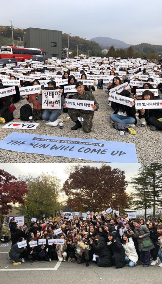 또 태양은 “감사합니다. 사랑합니다”라는 글과 함께 이날 오전 전역현장에서 만난 팬들과 함께 찍은 사진도 공개했다. 팬들은 ‘나의 빛, 나의 태양’이라고 적힌 플랜카드를 들고 있고, 태양 역시 플랜카드를 들과 팬들 사이에서 함께 사진을 찍으며 응원을 와준 팬들에 고마움을 전했다.