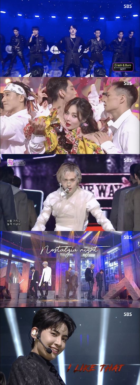 이날 방송에서는 갓세븐부터 현아, 던까지 다양한 가수들의 컴백무대가 이어졌다. 먼저 새 앨범 'Call My Name'으로 돌아온 갓세븐은 수록곡 'Crash & Burn'과 '니가 부르는 나의 이름' 무대를 꾸미며 강렬한 퍼포먼스와 치명적 매력을 발산했다.