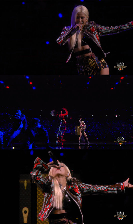 (여자)아이들 소연이 2019 롤드컵 결승전 개막식 무대에서 강렬한 카리스마를 뽐냈다.