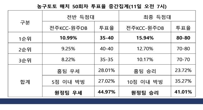 자세한 투표율을 살펴보면, 양팀의 10점 이내 박빙은 35.27%를 기록했고, 홈팀 전주KCC의 승리 예상은 23.72%로 나타났다.
