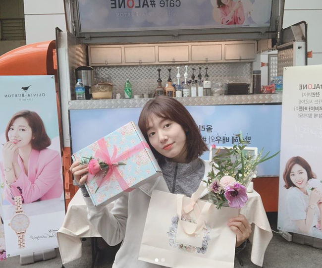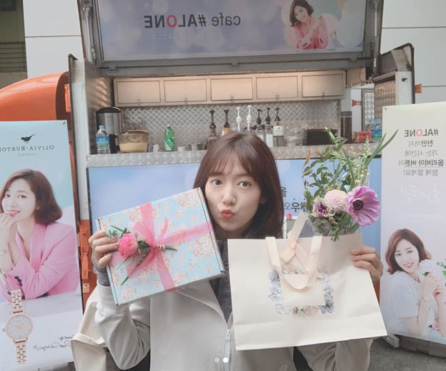 공개된 사진 속에서 박신혜는 지인이 보낸 커피차 앞에서 입술을 내밀며 깜찍한 포즈를 취하고 있으며 양손 가득한 선물들로 행복한 미소를 짓고 있다.