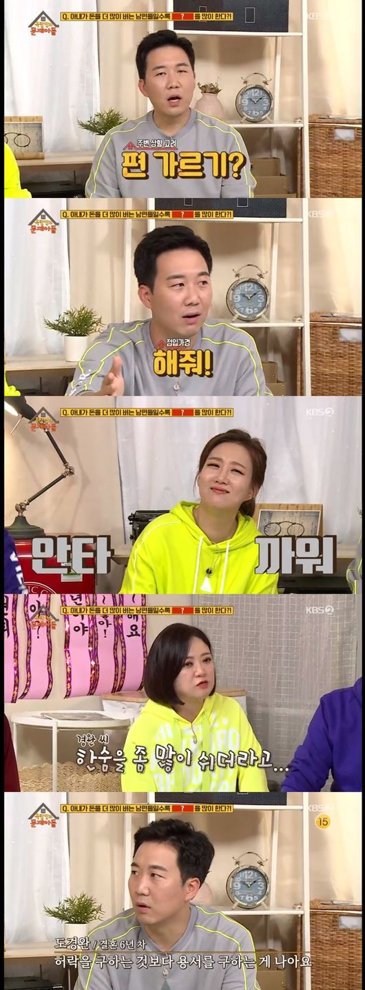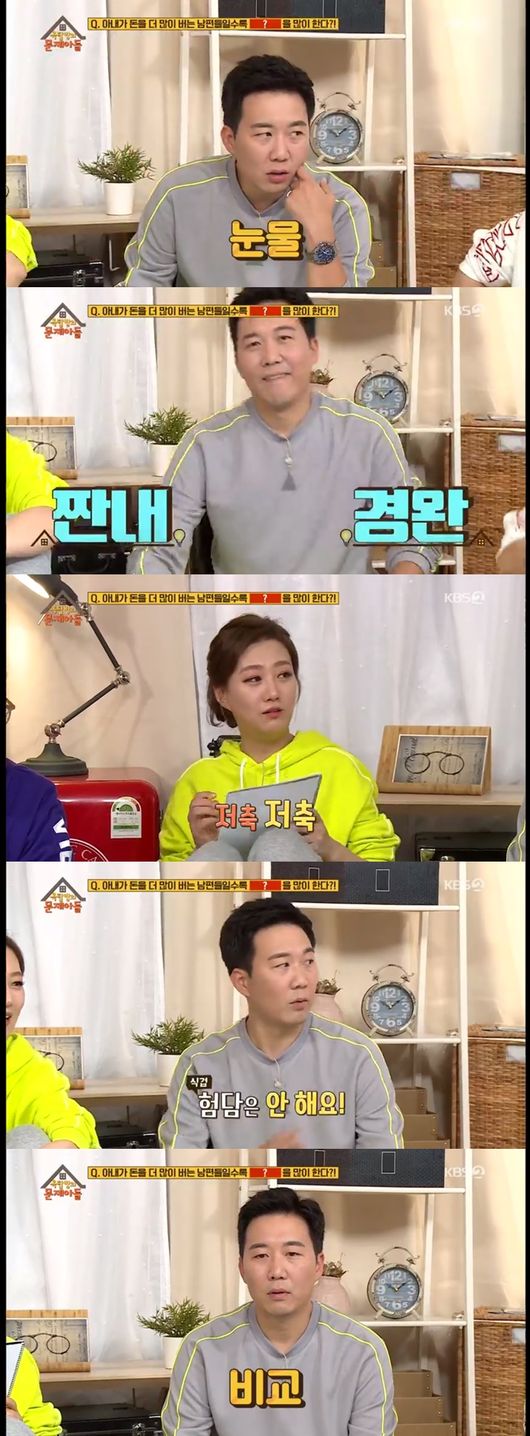 이날 '아내가 돈을 더 많이 버는 남편일수록 이것을 많이 한다'라는 문제가 출제됐다. 이에 송은이는 "아내의 험담 아니냐"라고 물었다. 이에 도경완은 "험담은 안 한다. 차라리 질투를 한다"라고 말해 웃음을 자아냈다.