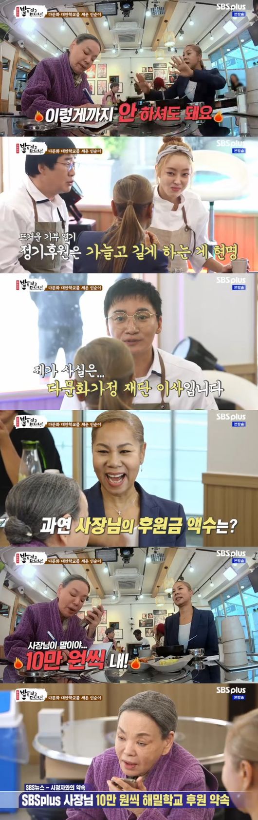 이어 제작진과 출연자 모두 뜨거운 기부가 이어졌다. 조재윤은 다문화가정 재단이사이라며 더욱 적극적으로 나섰다. 김수미는 갑자기 SBS PLUS 사장에게도 전화를 걸면서 기부를 전했고, 사장 역시 10만원씩 해밀학교 후원 약속해 훈훈함을 안겼다.