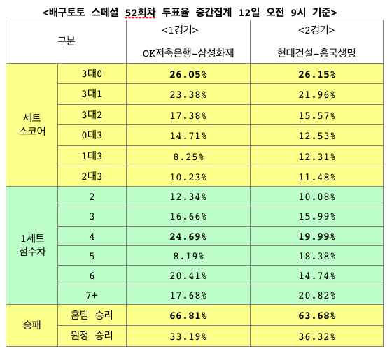 원정팀 삼성화재의 승리 예상은 33.19%의 투표율을 기록했고, 최종 세트스코어에서는 3-0 OK저축은행 승리 예상(26.02%)이 가장 높게 집계됐다. 1세트 점수차 예상에서는 4점차(24.69%)가 1순위로 집계됐다.