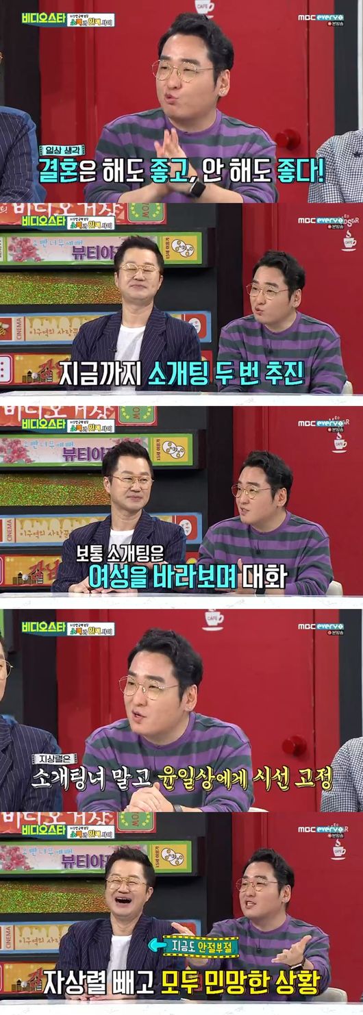 이날 윤일상은 "지상렬 결혼시키기 추진 중이다. 두 명 정도 소개를 시켜줬다"며 "소개팅을 하면 예의 상 그 여자분을 쳐다봐야 하는데 자꾸 나를 쳐다본다. 수줍음을 너무 많이 탄다. 앞에 여자 분이 있는데도 글쎄다라고 한다"라고 말해 웃음을 자아냈다.