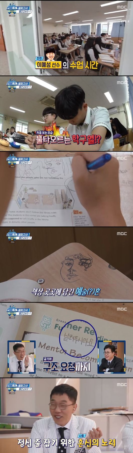 이어 이예성학생의 수업시간, 산만하게 물건을 계속 만지는가하면, 책상과 교과서에 계속해서 낙서를 하는 모습을 보였다. 이에 붐과 MC들은 "그림을 잘그린다"고 칭찬을 했고, 수업내내 졸다가 끝나는 종이 치자마자 다시 일어나는 모습을 보였다. 연달아 민지도 시계를 보자마자 종이 친다는 걸 알아채고 교실을 나서는 모습을 보여 MC들의 찬사를 받았다. 이어지는 시간은 급식시간. 민지는 급식도 찬사를 아끼지 않았다. 이에 서장훈은 "학교를 사랑하는 마음이 대단하다"고 했고, 이어 붐은 "저런 친구들은 졸업식에서 오열한다"고 했다.