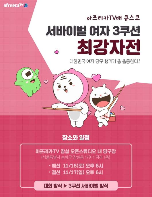 아프리카TV는 오는 16일부터 서울 잠실 아프리카TV 당구 오픈 스튜디오에서 ‘아프리카TV배 큐스코 서바이벌 여자 3쿠션 최강자전’을 개최한다.