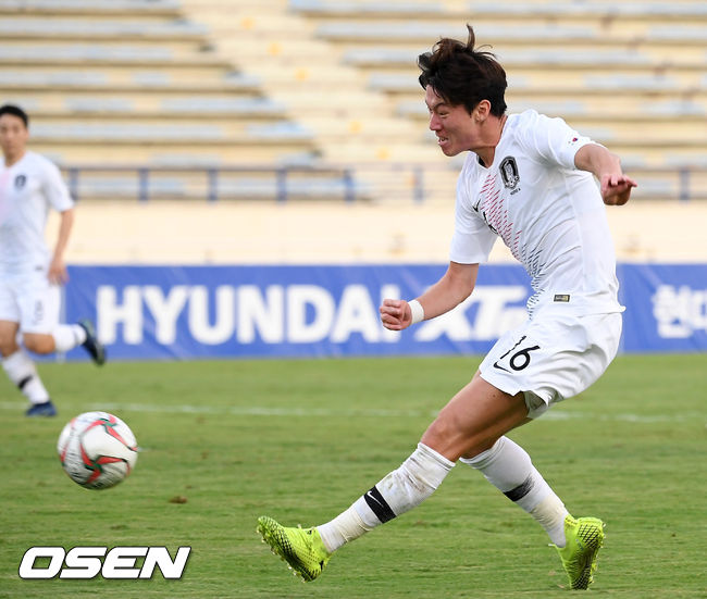 한국은 전반 원톱 황의조를 필두로 좌측 윙어 손흥민이 지원했다. 한국은 전반 내내 답답한 경기력 끝에 0-0으로 소득을 올리지 못했다. 후반 시작과 동시에 황인범(밴쿠버) 대신 황희찬이 들어가자 분위기가 바뀌었다. 후반 8분 황희찬의 패스를 받은 황의조의 회심의 왼발 슈팅이 골키퍼에 막혔다.