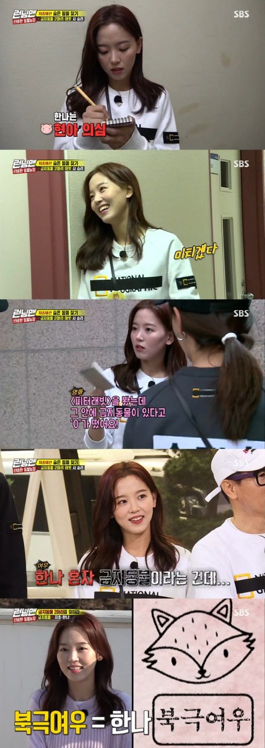 지난 17일 방송된 SBS 예능프로그램 '런닝맨'에는 잔치에 초대받지 못한 금지 동물을 찾는 '신비한 동물농장' 레이스가 본격적으로 진행됐다. 강한나는 런닝맨 멤버들이 찾아내야 할 금지 동물의 후손인 '사람'으로 변신해 뛰어다녔다.